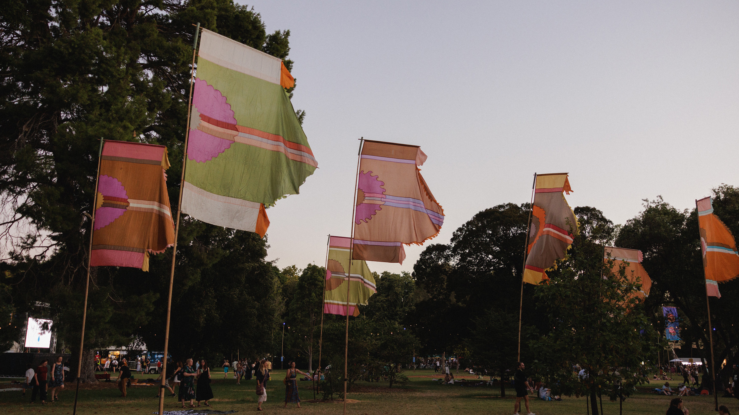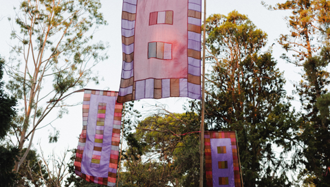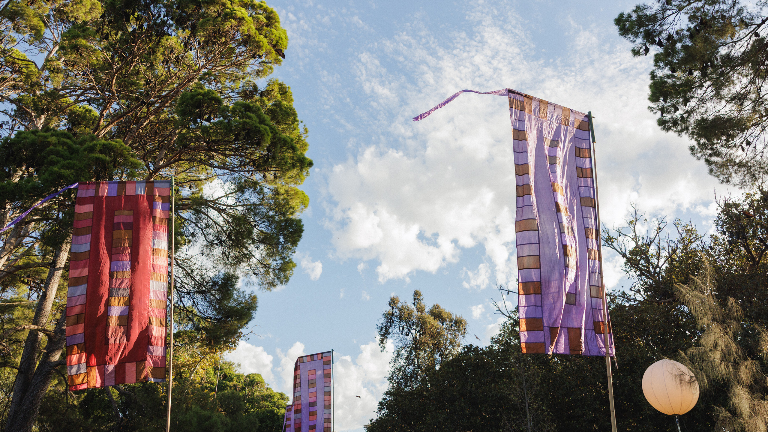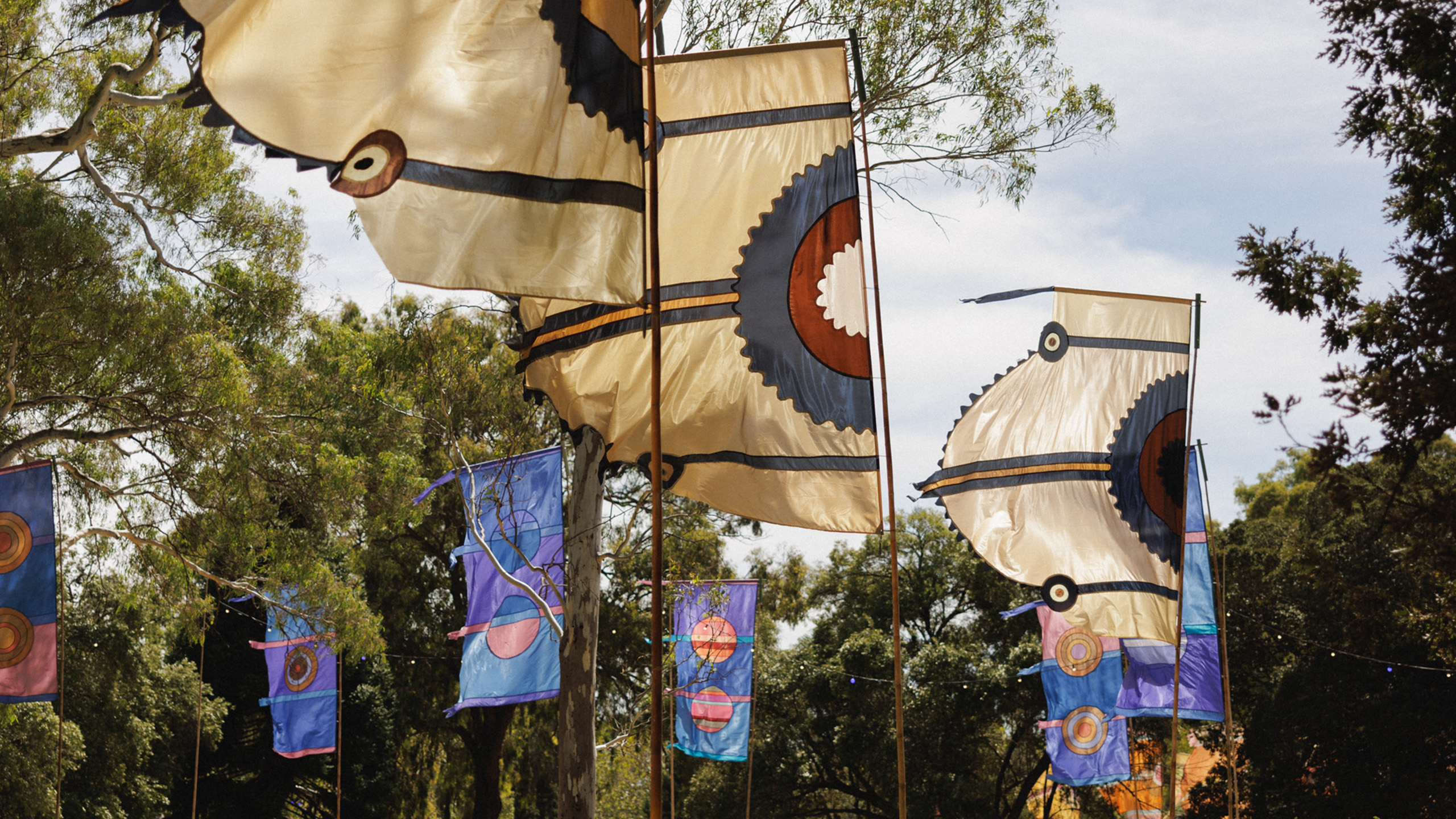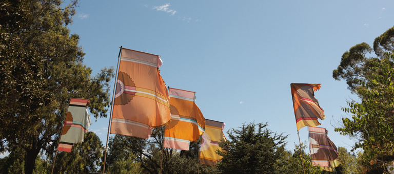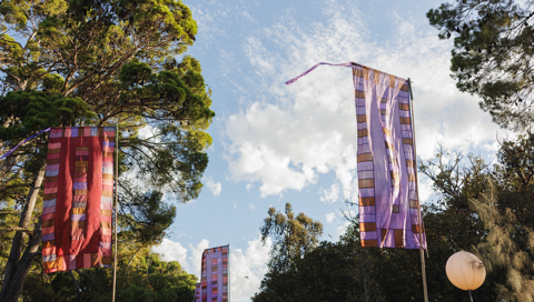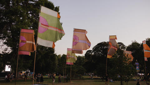 Born in his home studio in the UK and Spain, Watt’s flags made their way down under and have adorned the WOMADelaide site since 1999, adding pops of colour and movement amongst the trees during the festival.